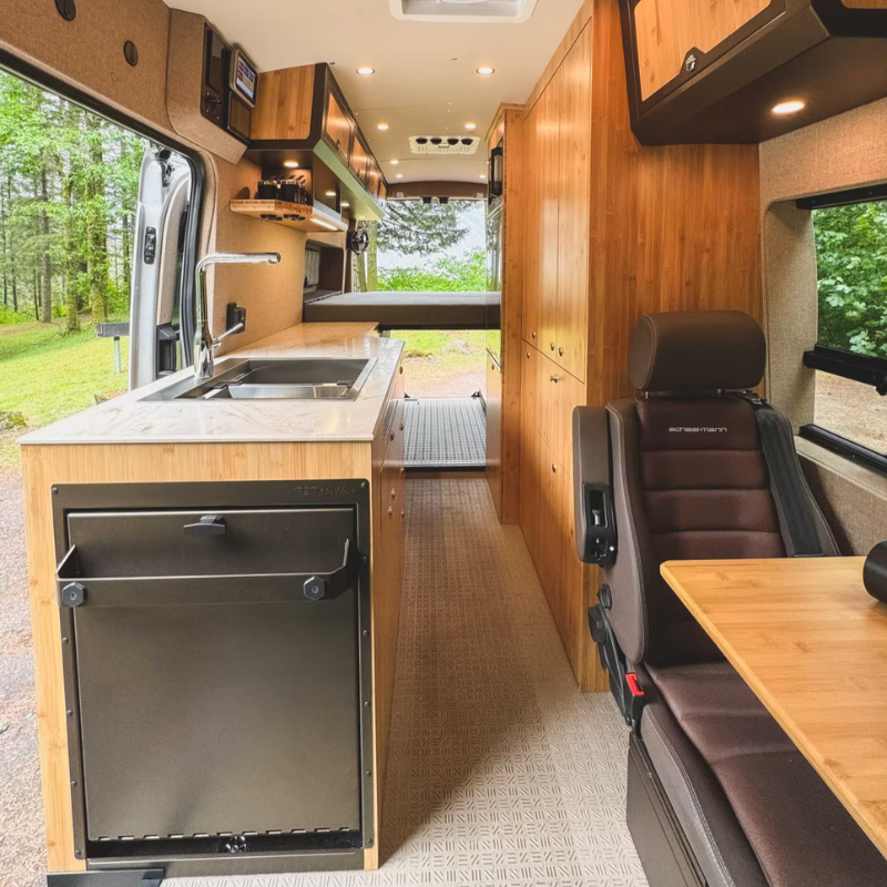 This layout is great because it puts your shower in the tallest part of your van and can plumb directly into a hot water supply located in the garage area.